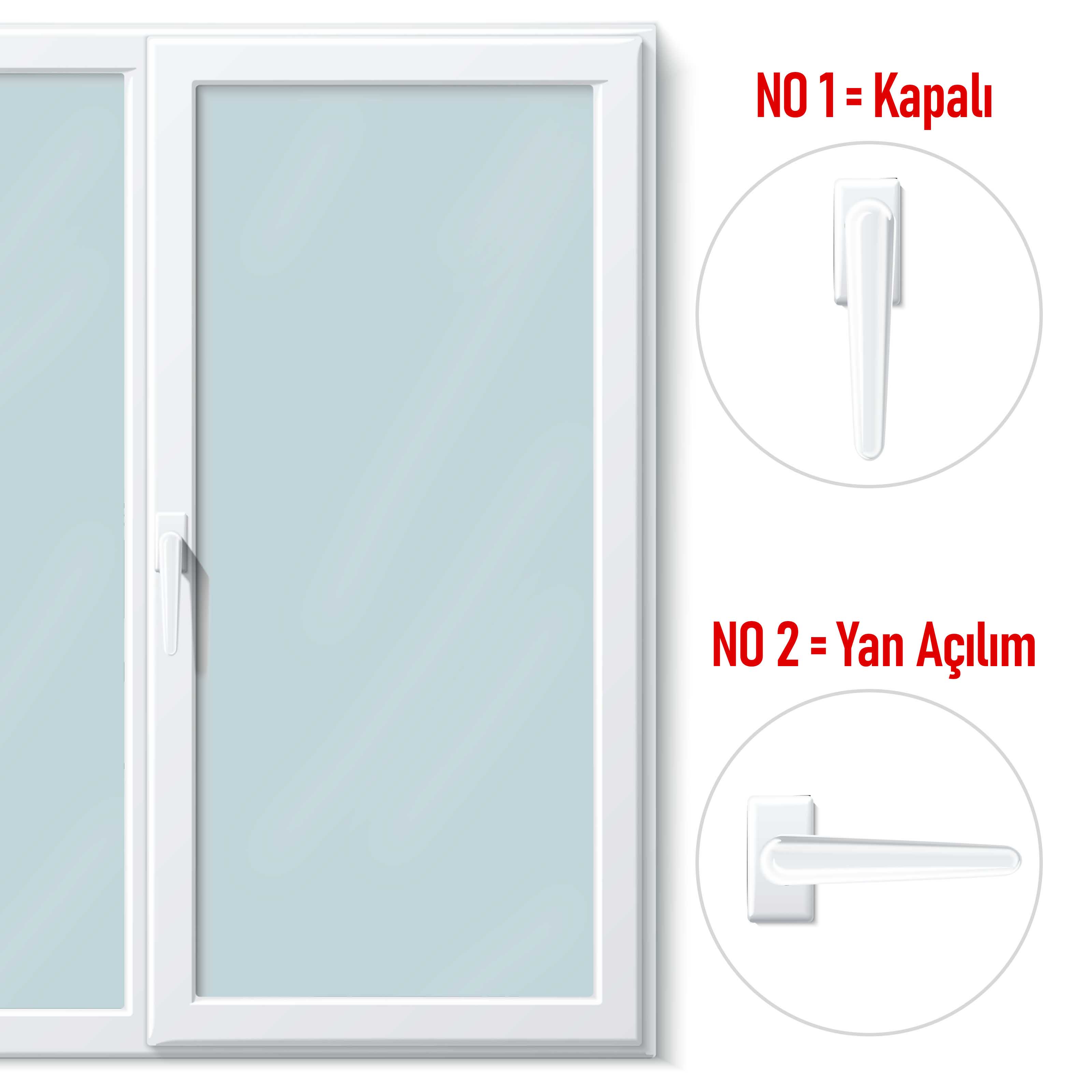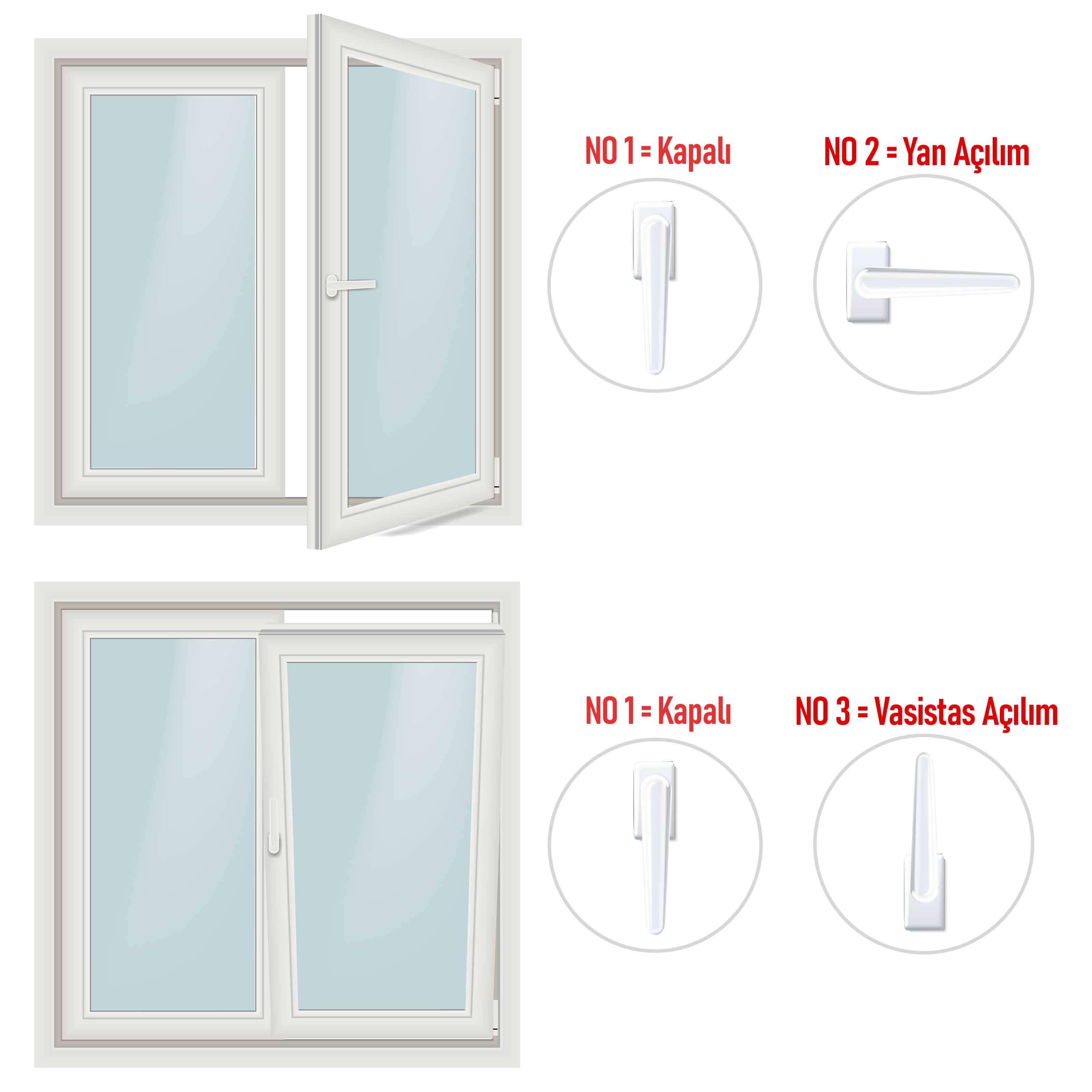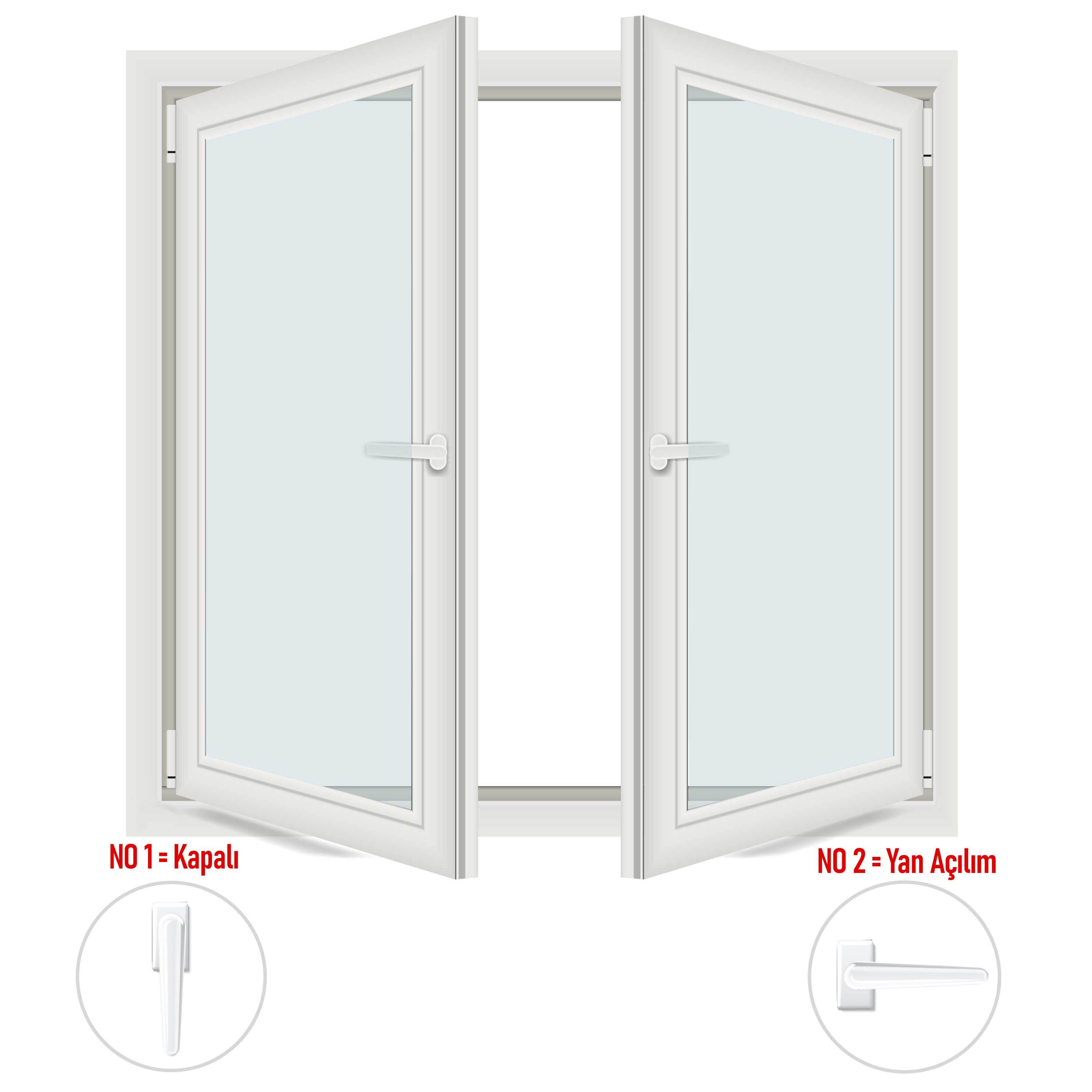 Pencerenin Kolu 1 No'lu konumdan 2 No'lu konuma getirilip kanat çekilerek açılır.